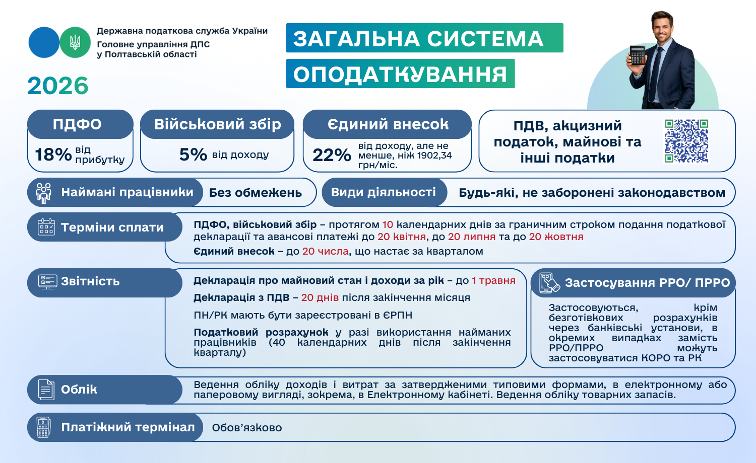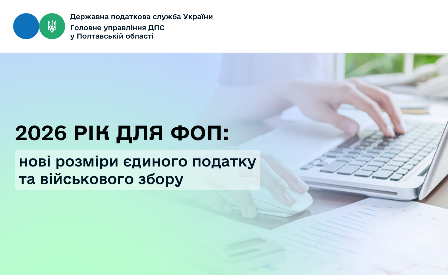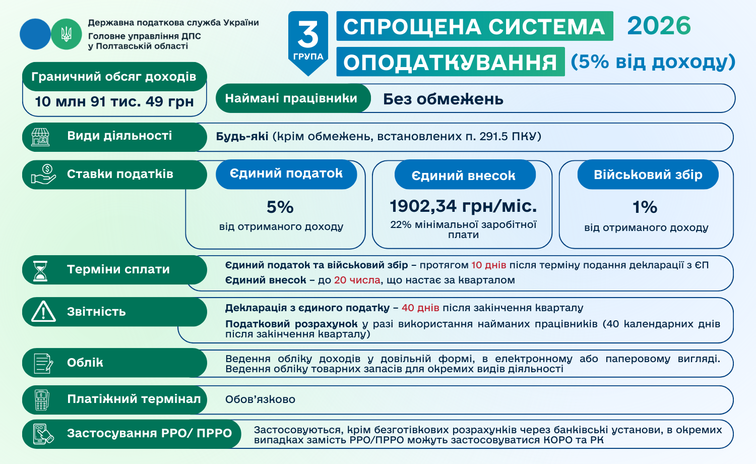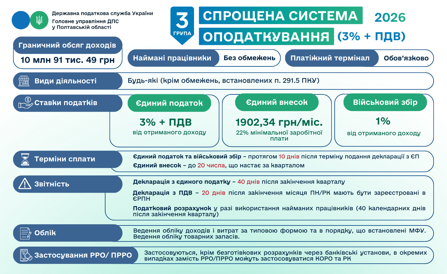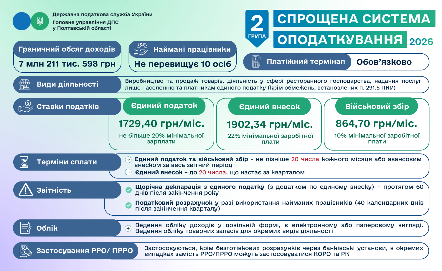 Головне управління ДПС у Полтавській області інформує, що з 1 січня 2026 року для фізичних осіб – підприємців, які працюють на першій та другій групах єдиного податку, діятимуть нові розміри ставок єдиного податку та військового збору.