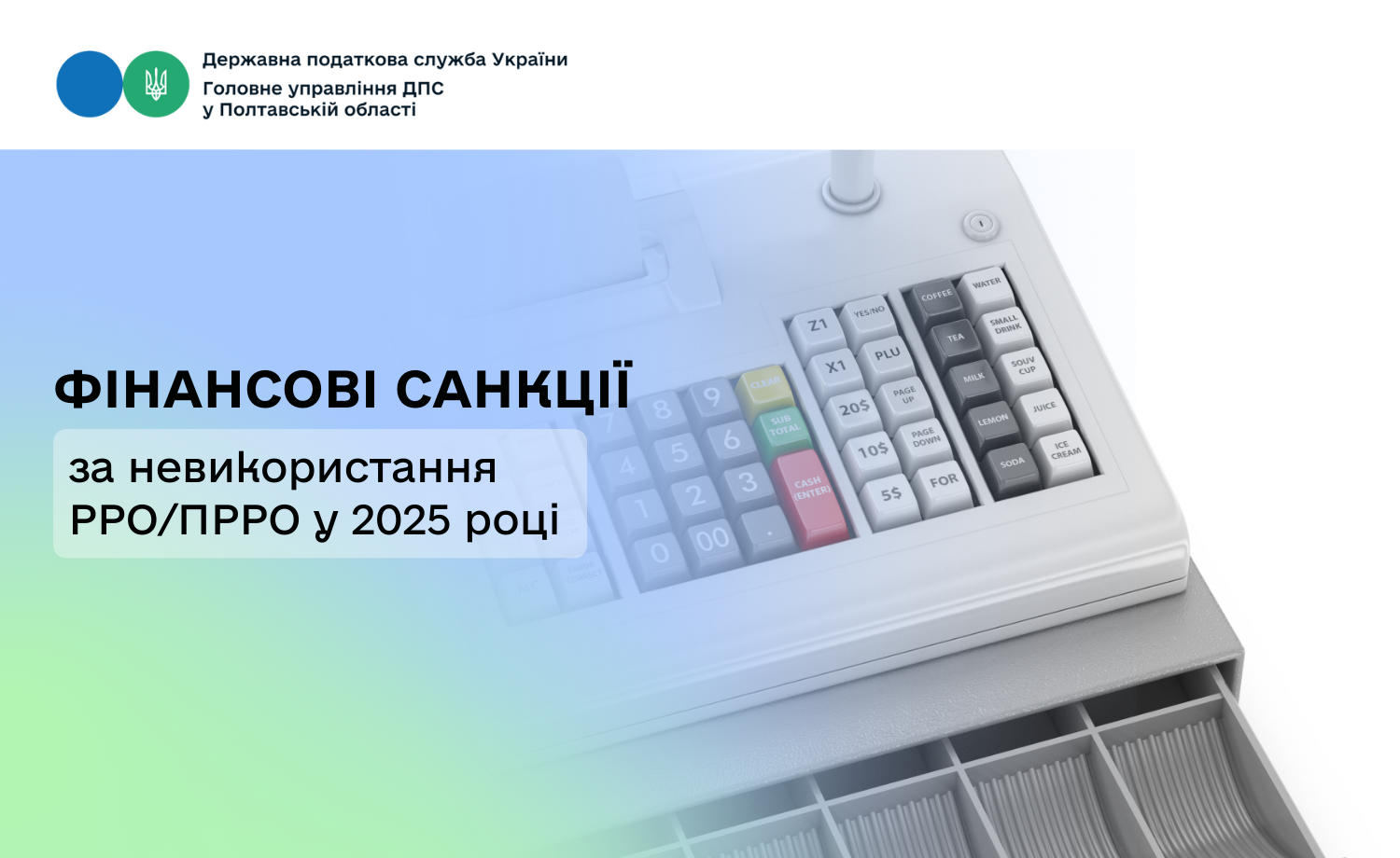 оловне управління ДПС у Полтавській області звертає увагу суб'єктів господарювання, що відповідно до пункту 15 розділу ІІ «Прикінцеві положення» Закону України від 06.07.1995 № 265/95-ВР «Про застосування реєстраторів розрахункових операцій у сфері торгівлі, громадського харчування та послуг» (далі – ЗУ № 265/95-ВР), із змінами і доповненнями, у період з 01 серпня 2023 року по 31 липня 2025 року, але не пізніше ніж до дати припинення або скасування воєнного стану на території України, до фізичних осіб – підприємців, які є платниками єдиного податку та не зареєстровані платниками податку на додану вартість, що здійснюють діяльність з продажу товарів (крім підакцизних товарів, технічно складних побутових товарів, що підлягають гарантійному ремонту, лікарських засобів, виробів медичного призначення, ювелірних та побутових виробів з дорогоцінних металів, дорогоцінного каміння, дорогоцінного каміння органогенного утворення та напівдорогоцінного каміння) або надають послуги, фінансова відповідальність за проведення розрахункових операцій з використанням реєстраторів розрахункових операцій (далі – РРО), програмних РРО (далі – ПРРО) або розрахункових книжок на неповну суму вартості проданих товарів (наданих послуг), непроведення розрахункових операцій через РРО та/або ПРРО з фіскальним режимом роботи, невидачу (у паперовій та/або електронній формі) відповідного розрахункового документа, що підтверджує виконання розрахункової операції, або проведення її без використання розрахункової книжки на окремому господарському об’єкті такого суб’єкта господарювання застосовується у таких розмірах: