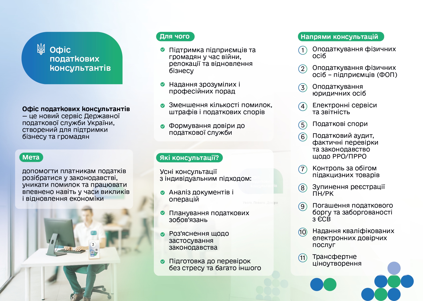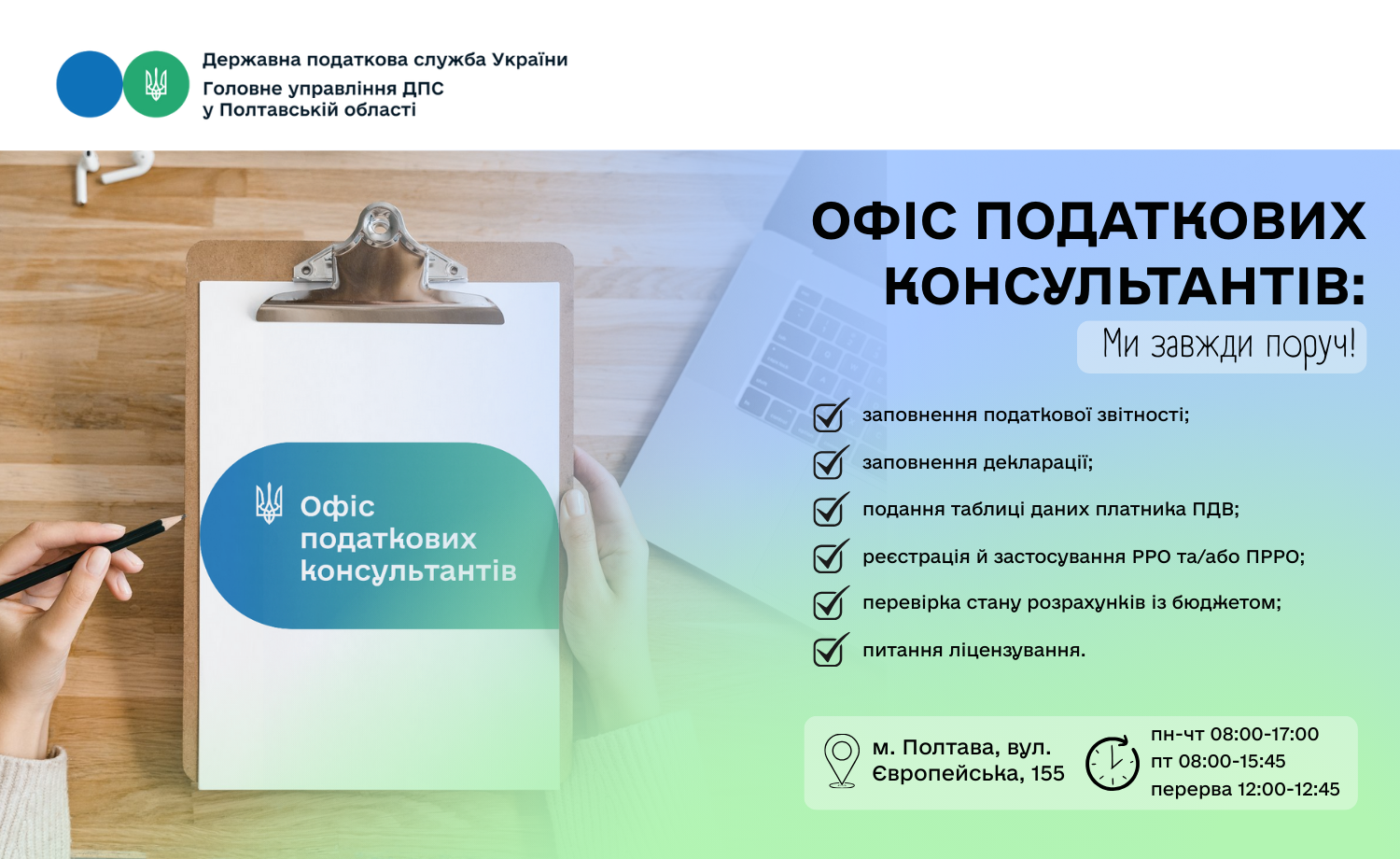 Якщо виникли питання щодо податкового та іншого законодавства, контроль за яким здійснюють податкові органи, якщо потрібна практична або консультаційна допомога висококваліфікованих фахівців у заповненні податкової звітності, заповненні декларації, поданні таблиці даних платника ПДВ, реєстрації й застосуванні РРО та/або ПРРО, перевірки стану розрахунків із бюджетом, ліцензуванні – звертайтесь до фахівців Офісу податкових консультантів у Полтавській області.