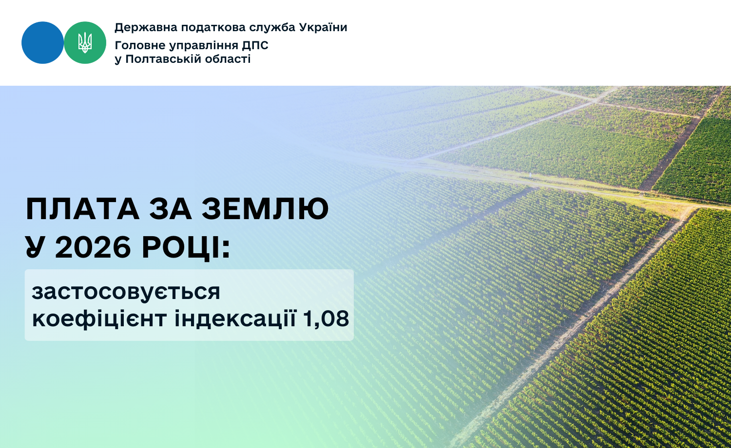 Головне управління ДПС у Полтавській області інформує, що коефіцієнт індексації нормативної грошової оцінки земельної ділянки у 2026 році (за 2025 рік) становить 1,08. Він застосовується до всіх категорій земель і видів земельних угідь.