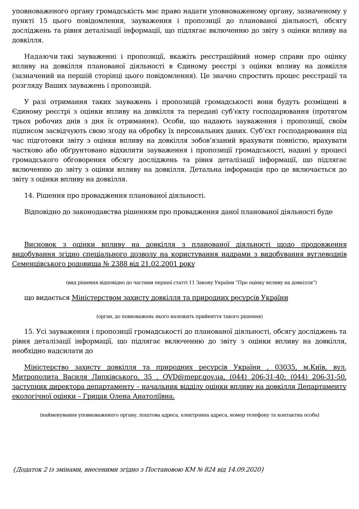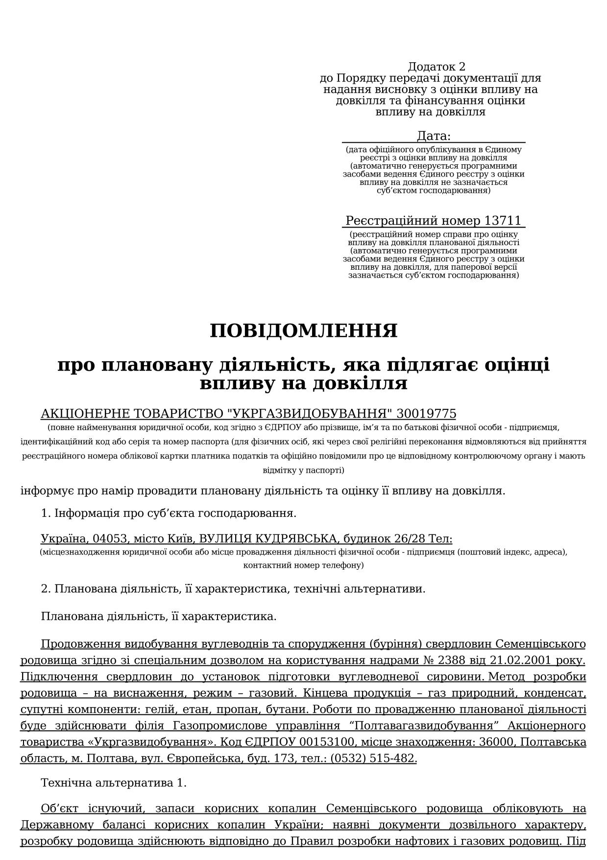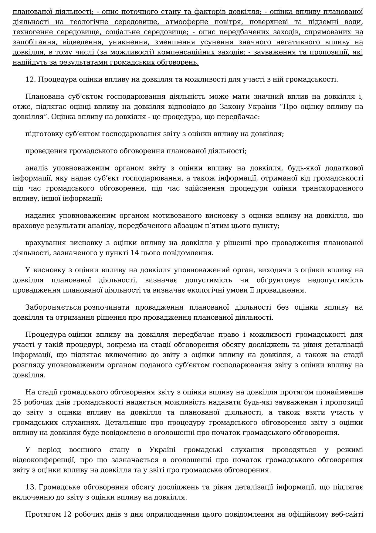 ПОВІДОМЛЕННЯ про плановану діяльність, яка підлягає оцінці впливу на довкілля